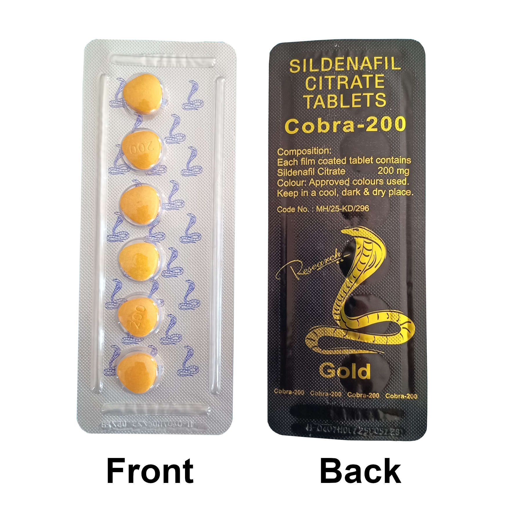 Cobra 200 Gold erection tablets belong to the group of Viagra generics containing sildenafil citrate. These medicines are used to treat erectile dysfunction (ED). The active ingredient of the pill is 200 mg of sildenafil citrate. It belongs to the class of medicines known as PDE-5 inhibitors. Sildenafil increases blood flow to the penis following sexual stimulation and does this by blocking the enzyme responsible for cGMP breakdown. cGMP is a substance that relaxes and widens blood vessels and smooth muscle cells. This process allows men to keep an erection hard enough for sex.